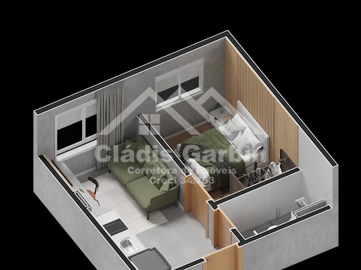 1 dormitório + sala de estar + cozinha + lavanderia + banheiro