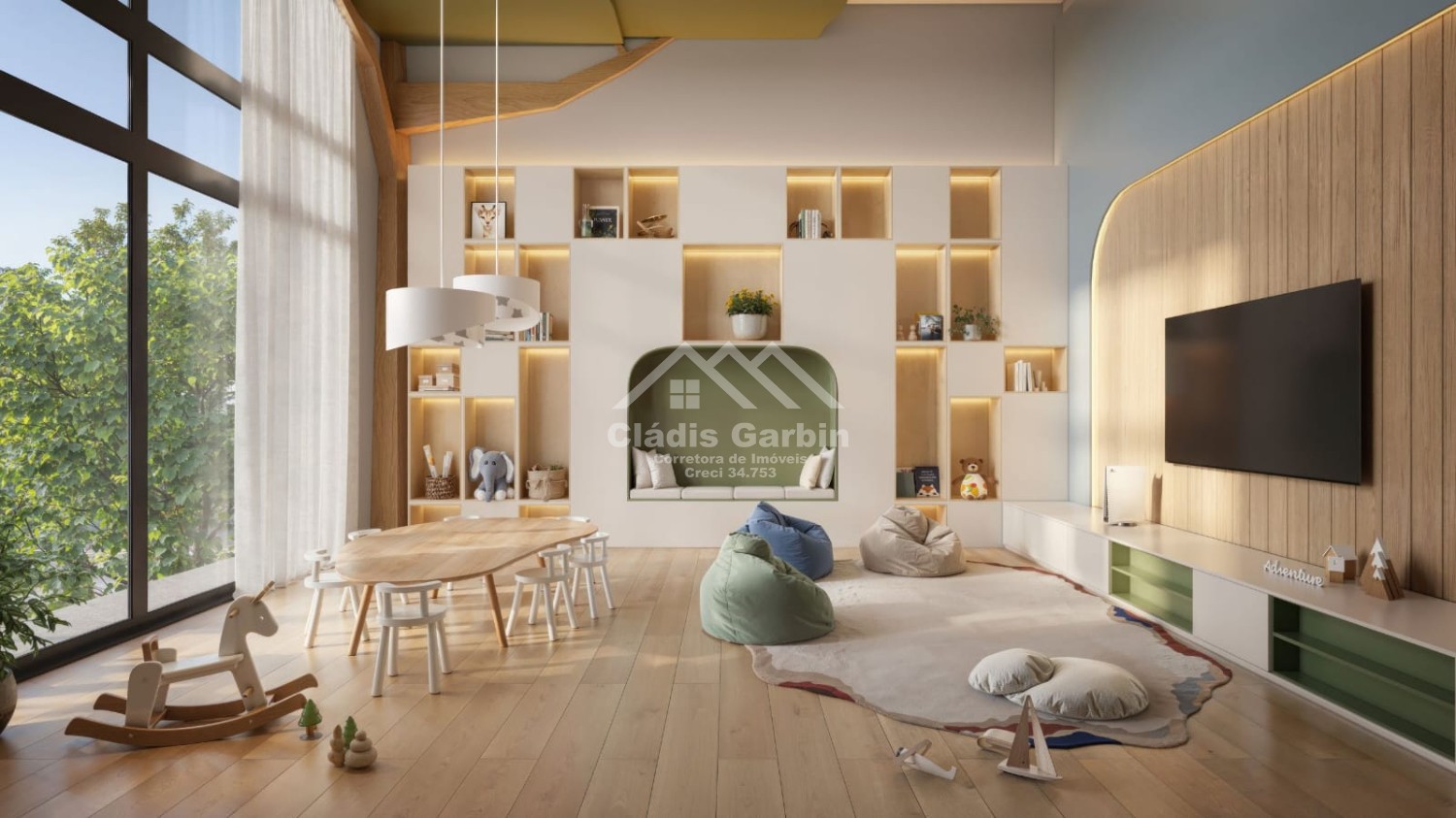Salão de festas com pé direito elevado