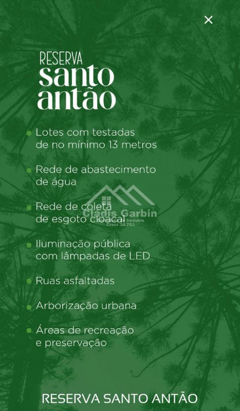 Descrição › CLÁDIS CORRETORA DE IMÓVEIS vende terrenos no LOT. RESERVA SANTO ANTÃO situado na Rua Plauto de Abreu, lotes de 390m² a 800m², a partir de R$ 234.000,00.